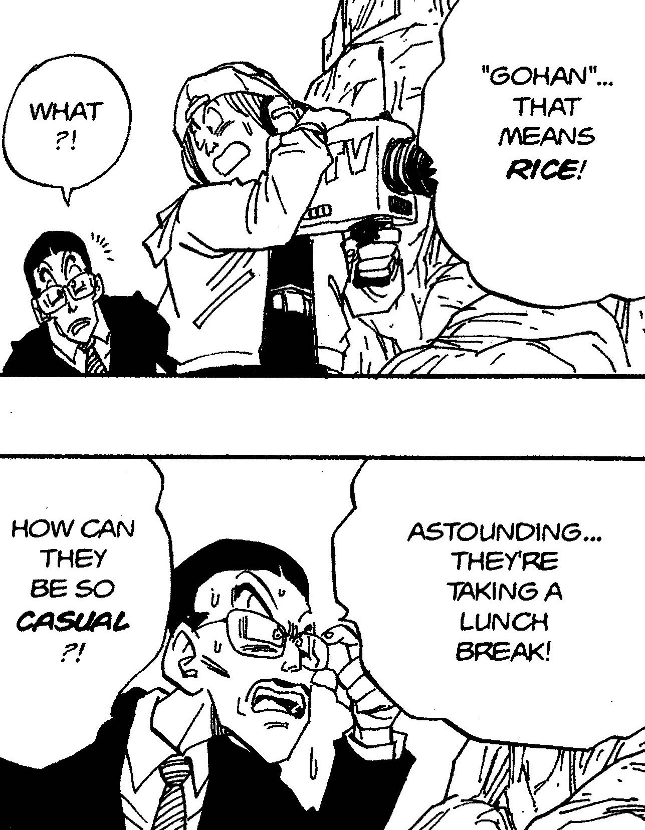 Dieu merci. Pendant les Cell Games, quand Goku a dit : "Tu es debout... Gohan !!" ce gars a mal compris et a dit,"Incroyable... Ils font une pause déjeuner !" (Gohan en japonais signifie nourriture) C'était une blague si évidente que je ne l'ai jamais oubliée.