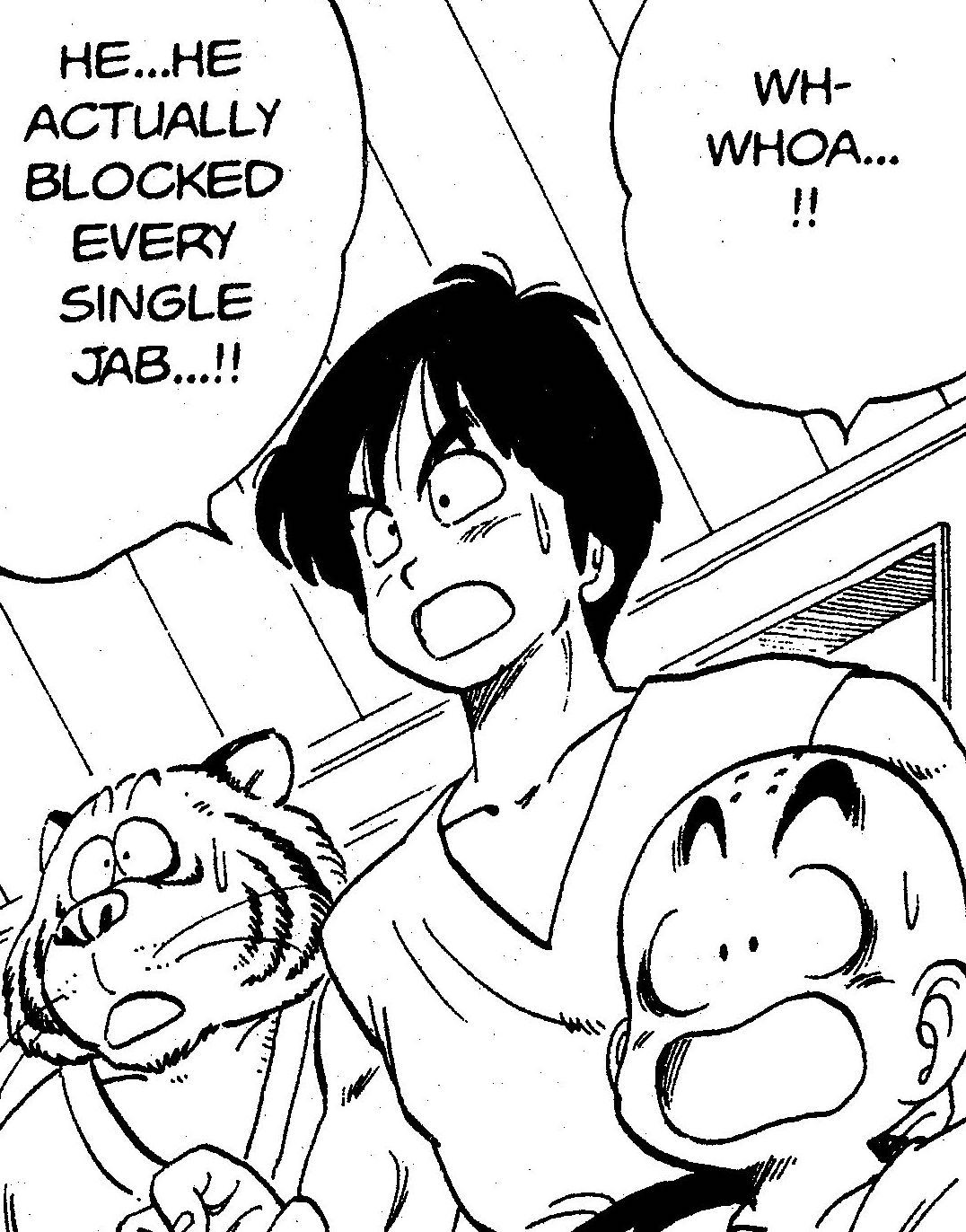 je veux soulignerles lignes de vitesse en arrière-plan.En regardant la façon dont c'est dessiné,Je ne pense pas qu'il soit le seul personnage d'arrière-plan du panel. En fait, je penseil est recadré à partir d'un panneau de plusieurs personnages d'arrière-plandebout sur le côté. Et si je dois deviner où genre de scène il serait, ce serait leTenkaichi Budokai.