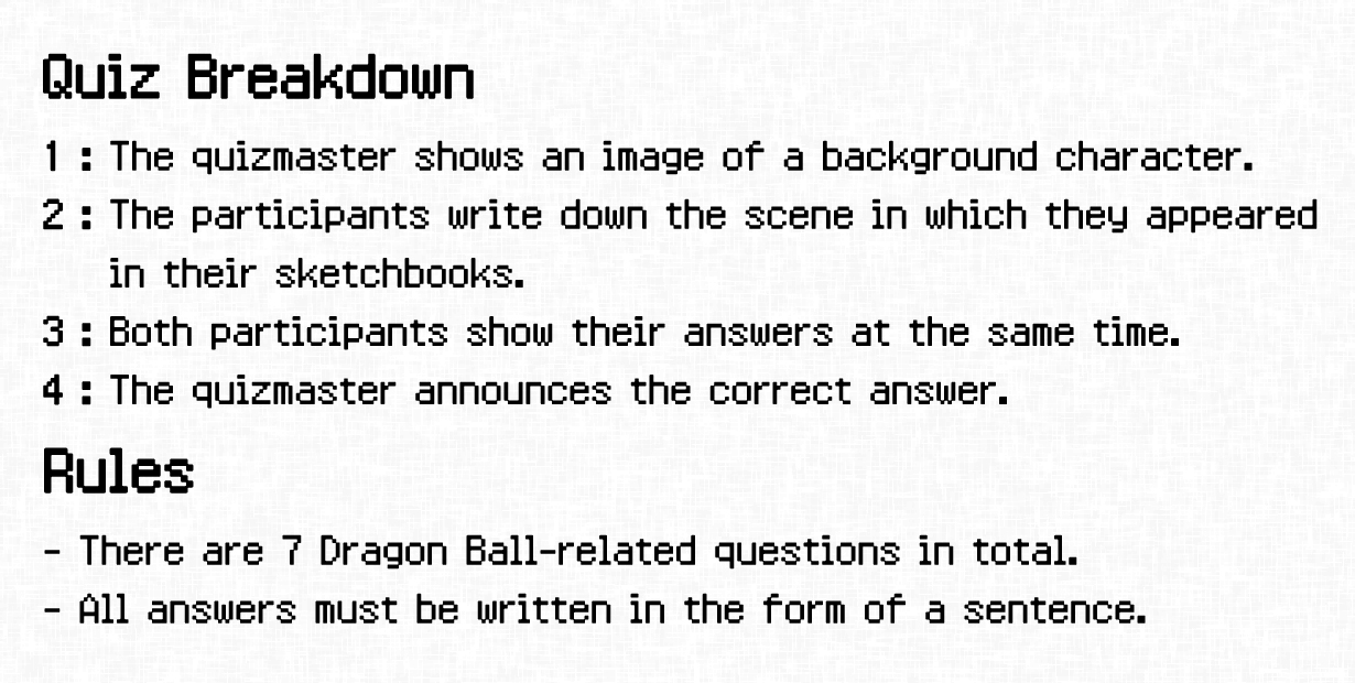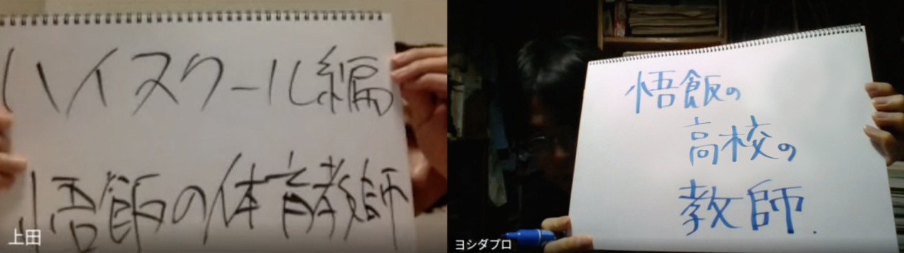 Ueda : Un membre de Red Ribbon Army ou quoi ? J'abandonne. Yoshida : Quelqu'un qui se tenait sur la touche pendant le Tenkaichi Budokai et qui avait l'air surpris par tout le monde (après que Piccolo ait fait quelque chose).