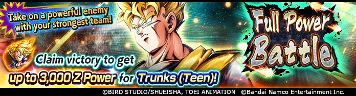 Full Power Battle est un mode dans lequel vous et 3 personnages amis affrontez un boss dans une bataille 4 contre 1 super stimulante ! Terminez les 3 étapes de l'événement pour obtenir 3 000 Z Power pour Super Saiyan Trunks (Teen) (DBL-EVT-46S) !