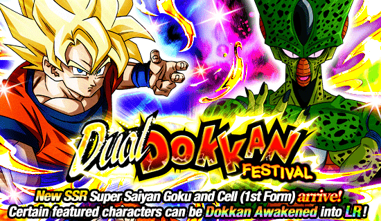 Un nouveau festival Dual Dokkan est lancé ! Dans une invocation, vous pourrez trouver le nouveau Super Saiyan Goku SSR, et dans l'autre il y a une nouvelle Cell SSR (1ère forme) !
