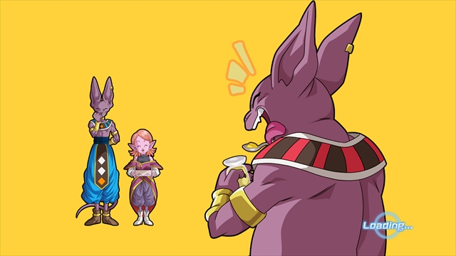 Cette illustration montre le Supreme Kai of Time offrant à Champa un pudding délicieux en cadeau ! Le God of Destruction de l'univers 6 est clairement fou de joie, mais Beerus a l'air de préparer quelque chose...