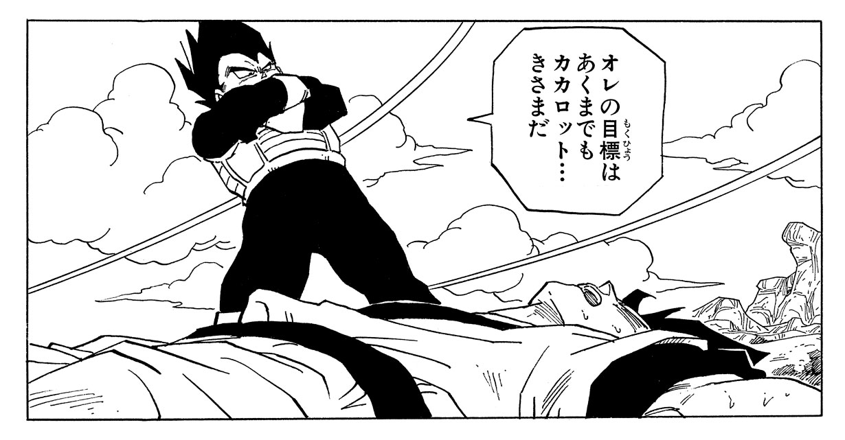--Les deux guerriers partagent l'objectif de vouloir devenir plus fort, mais leurs motivations sont intrinsèquement différentes. Ce qui me rappelle qu'après que les guerriers Z aient finalement vaincu Vegeta sur Terre, Goku empêche ses amis de mettre fin à la vie de l'envahisseur et les convainc de laisser Vegeta s'échapper.