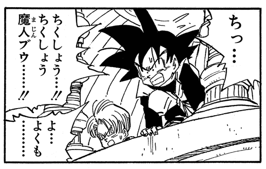 Plus tard, Goten et Trunks sont raillés par Majin Buu et juste au moment où ils se transforment en Super Saiyan 3 Gotenks pour défier à nouveau le méchant, le Majin est capable de les absorber avec Piccolo et se met encore plus en marche.