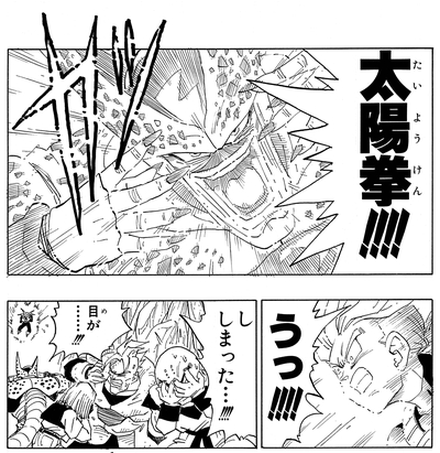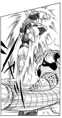 Cell aveugle Trunks, Krillin et les autres avec cette technique et utilise ensuite l'ouverture qu'elle fournit pour absorber Android 18.