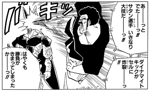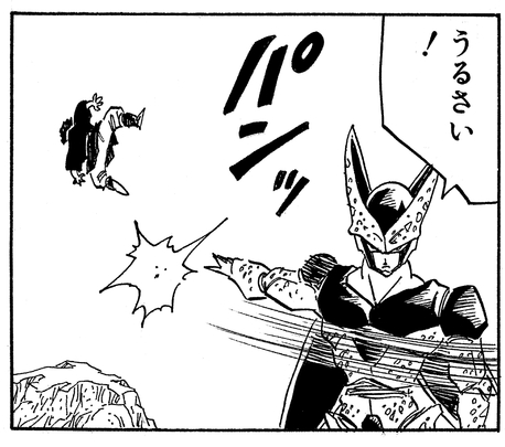 Le champion du monde est tellement convaincu de sa supériorité qu'il déchaîne une rafale d'attaques contre Cell, qui ne ressent rien mais s'énerve suffisamment pour écraser rapidement Mr. Satan comme un insecte.