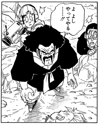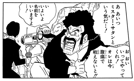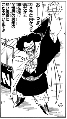 Le champion se retrouve abasourdi une fois qu'il est témoin de l'incroyable force de Goku et Cell et feint un mal de ventre pour éviter de se battre.