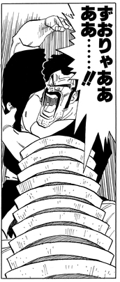 Dans une tentative d'intimider Cell, il s'exhibe en brisant une énorme pile de 14 carreaux de céramique juste devant la terreur Bio-Android, puis pointe les décombres et menace de lui faire la même chose.