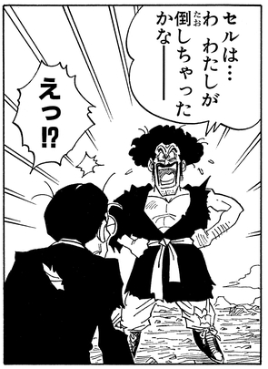 Bien qu'il se soit mis à l'écart, Mr. Satan parvient à aider au combat entre Cell et Gohan en jetant la tête d'Android 16 près du jeune guerrier en difficulté. L'androïde déchu transmet ensuite ses dernières paroles de sagesse au jeune demi-Saiyan. En conséquence, le champion du monde joue finalement un rôle déterminant en aidant Gohan à se transformer pour la première fois en état Super Saiyan 2 .