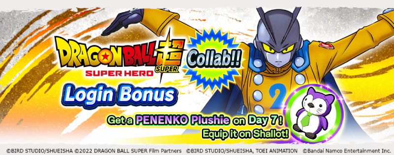 Une campagne de collaboration avec le film à succès Dragon Ball Super: SUPER HERO est en cours ! Connectez-vous tous les jours pour obtenir des tickets d'invocation et toutes sortes d'autres objets ! Le septième jour, vous pouvez obtenir un accessoire spécial PENENKO Plushie (Violet) que vous pouvez équiper sur Shallot!