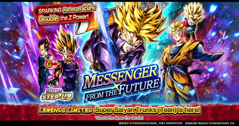 La première moitié de cette invocation a l'incroyable bonus d'une double puissance Z et un taux de drop SPARKING de 20 % ! De plus, vous pouvez obtenir [MESSENGER FROM THE FUTURE] des pièces d'invocation gratuites pendant toute la période d'invocation à échanger contre le pouvoir Z de Super Saiyan Trunks (Teen) (DBL50-01S), des tickets d'invocation et d'autres objets incroyables à la boutique d'échange. !