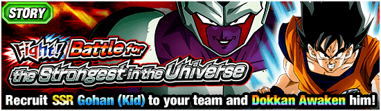 Le "Combattez! Bataille pour le plus fort de l'univers!" L'événement de l'histoire est jouable maintenant ! Incluez autant de personnages de la catégorie spécifiée dans votre équipe que possible pour maximiser le nombre d'objets récupérés par le boss ! Vous pouvez également recruter le nouveau personnage SSR [Cheerful and Righteous Heart] Gohan (Kid) puis l'éveiller Dokkan avec les médailles d'éveil disponibles dans cet événement !