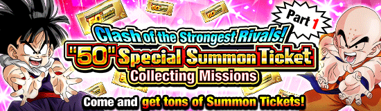 La partie 1 de "Clash of the Strongest Rivals! "50" Special Summon Ticket Collecting Missions" est arrivée ! Effacez les missions de l'événement pour obtenir des récompenses incroyables comme "50" tickets d'invocation spéciale et plus encore ! Ces missions événementielles sont toutes liées à la campagne "Combattez ! Bataille pour le plus fort de l'univers !" événement mentionné ci-dessus! More de ces missions devraient être publiées dans les prochains jours, alors terminez les missions dans toutes les parties pour collecter cinquante des "50" tickets d'invocation spéciale ! Ensuite, utilisez vos tickets collectés pour jouer à la "Célébration de la campagne mondiale ! "50" Special Summon" ! Jouer cette invocation à cinquante tickets vous garantit un personnage pouvant être éveillé Dokkan en LR, alors ne ratez pas cette opportunité extraordinaire de renforcer vos équipes !