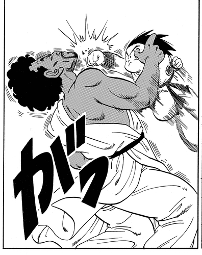 Les deux s'affrontent lors des préliminaires et le King Chappa est si confiant qu'il dit à Goku : "Ouvrez avec n'importe quel coup qui vous amuse !" C'est exactement ce qu'il fait en donnant un coup de poing solide à la mâchoire du roi Chappa.