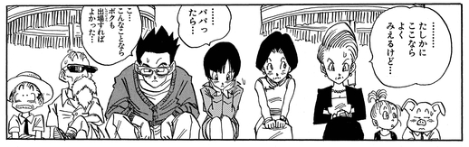 Alors qu'un groupe de spectateurs familiers, dont Gohan et Bulma , encouragent Pan avant son match contre Mo Kekko, Bulla crie : "Ne le tue pas !"