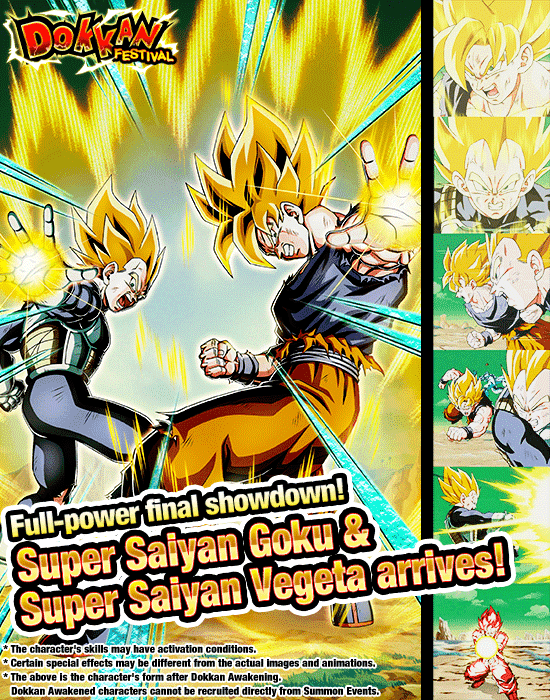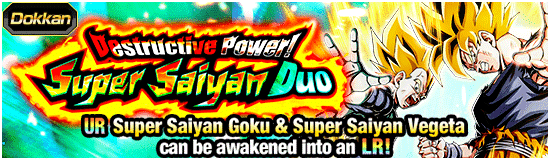 Une nouvelle invocation du Festival Dokkan est maintenant disponible ! Cette fois, les nouveaux SSR [Super Saiyan Duo] Super Saiyan Goku et Super Saiyan Vegeta éveillables par LR font leurs débuts ! Une fois Dokkan Awaken to LR, ils auront accès à une compétence active au combat lorsque les conditions d'activation seront satisfaites, et les médailles dont vous avez besoin pour Dokkan Awaken pourront être obtenues lors de l'événement Dokkan "Destructive Power! Super Saiyan Duo" !