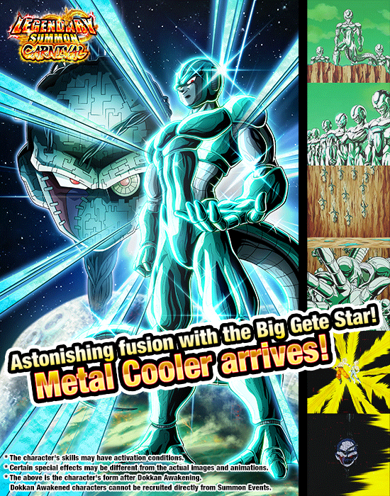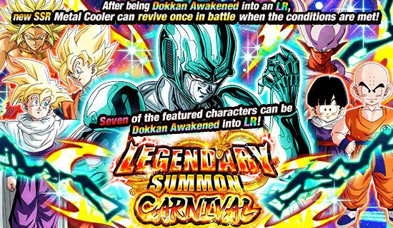 Un nouveau carnaval d'invocation légendaire est désormais en cours avec sept personnages incroyables qui peuvent être Dokkan Awakened to LR ! Parmi eux et faisant leurs débuts explosifs se trouve une nouvelle invocation exclusive "Carnival" : SSR [Grudge Rekindled] Metal Cooler!! Une fois Dokkan Awakened to LR, ce nouveau Metal Cooler aura la capacité de se réanimer une fois au combat lorsque les conditions d'activation de l'effet seront remplies ! Absorbez la force vitale de vos ennemis et plongez-les dans un abîme de terreur infinie !!