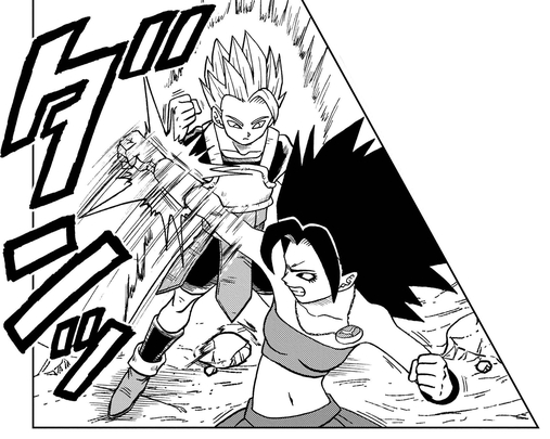 Bien qu'aussi puissant que soit Kefla , Caulifla est obligé de reconnaître une fois de plus - cette fois par Gohan - qu'il y a toujours quelqu'un de plus fort que vous, et à la fin ils se font sortir de l'arène lors de leur duel en tête-à-tête. .