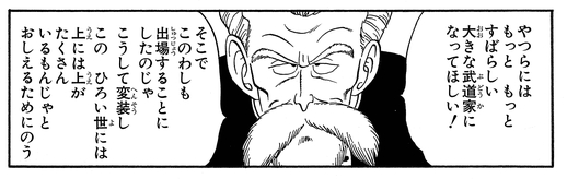 Le maître des arts martiaux puise dans son arsenal et libère une gamme de techniques comme Yoiko-Min-Min-Ken (Sleepy-Boy Technique) et Bankoku Bikkuri Sho (Lightning Flash Surprise), mais il est toujours incapable de décrocher une victoire contre Goku.
