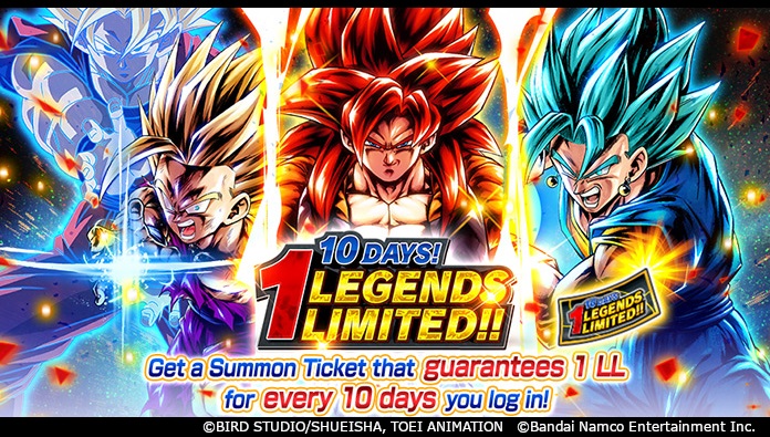 Pour chaque 10 jours de connexion, vous recevrez un "10 DAYS! 1 LEGENDS LIMITED !! Summon Ticket", qui vous garantira un personnage LEGENDS LIMITED ! Plus vous jouez d'invocations et plus vous avancez dans les étapes, plus de personnages géniaux s'ajoutent à la gamme ! Connectez-vous 40 jours pour obtenir le maximum de quatre "10 JOURS ! 1 LÉGENDES LIMITÉES !! Tickets d'invocation" !