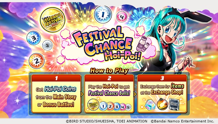 Récupérez les pièces Festival Chance Hoi-Poi #1 en terminant certaines étapes de bataille ou à partir des récompenses de mission ! Dans ce Hoi-Poi, Festival Chance Balls de différents rangs apparaîtra allant du 5e au 1er, plus un rang spécial au-dessus. Le prix spécial peut être échangé contre des objets incroyables, tels que des cristaux Chrono, de nouveaux étuis pour cartes Arts et Multi-Z Power 100 (LEGENDS LIMITED/SPARKING) ! Jouez à ce Hoi-Poi encore et encore et obtenez le prix spécial pour vous-même !