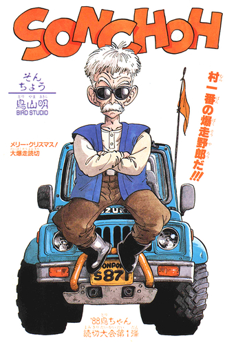 Sonchoh est apparu dans le cadre de l'événement "Merry Christmas! A Barrage of One-Shot Manga" de Weekly's Shonen Jump qui devait célébrer le magazine ayant 4,85 millions de numéros en circulation. Sonchoh est en grande partie une longue séquence de poursuite en voiture mettant en vedette l'aîné du village de Pon-Pon, qui conduit sa voiture préférée à la recherche de tout vaurien. Cette histoire a permis à Toriyama de dessiner quelque chose qu'il aime : les voitures. Il est donc naturel que les scènes de poursuite aient vraiment du punch !