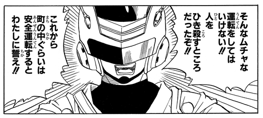 Afin de protéger le caractère sacré de son village, aucune infraction, aussi minime soit-elle, ne peut rester impunie ! Le sens aigu de la justice de cet aîné est assez similaire à celui d'un autre héros : Great Saiyaman!
