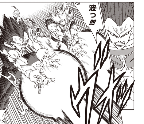 Avec la victoire gravée dans leur esprit, Goku et Vegeta se sont retrouvés face à Gas, qui venait de retourner sur le champ de bataille. Tout d'abord, il a affronté Vegeta, qui a continué à se lever et à se défendre, peu importe le nombre de fois où Gas l'a renversé, montrant davantage l'évolution de sa transformation Ultra Ego . Pendant ce temps, Goku a cherché à l'intérieur de lui-même et a puisé dans sa propre version unique d' Ultra Instinct.