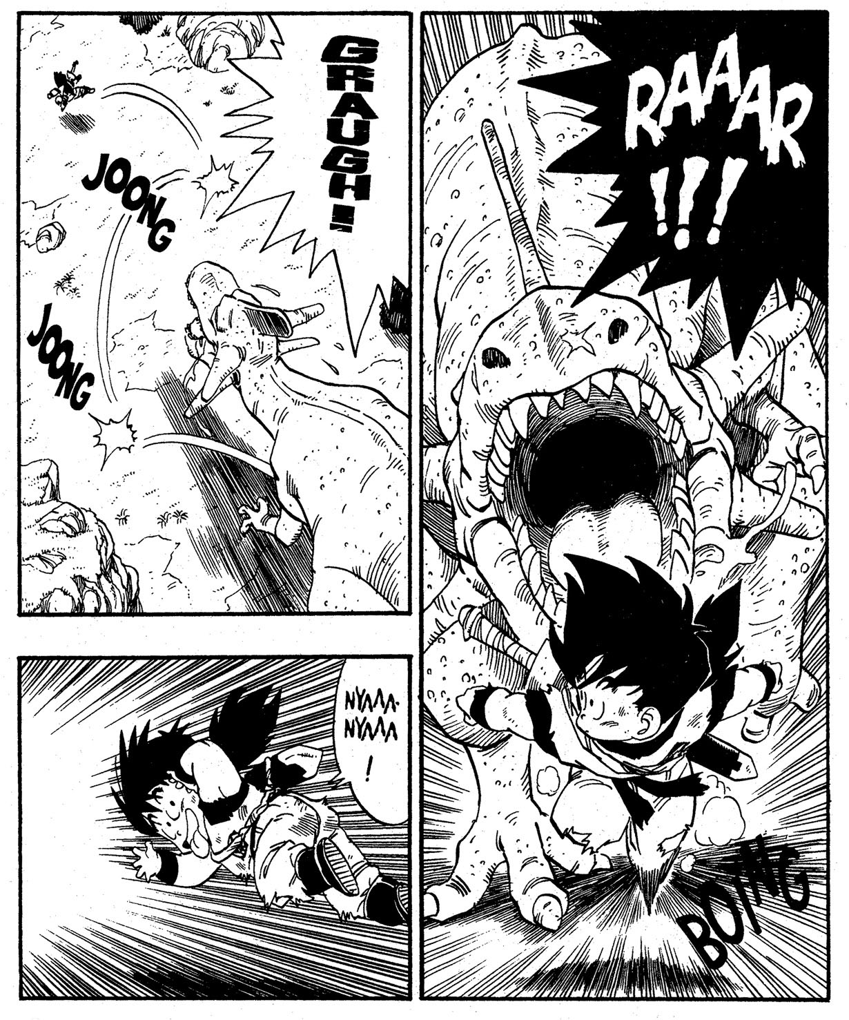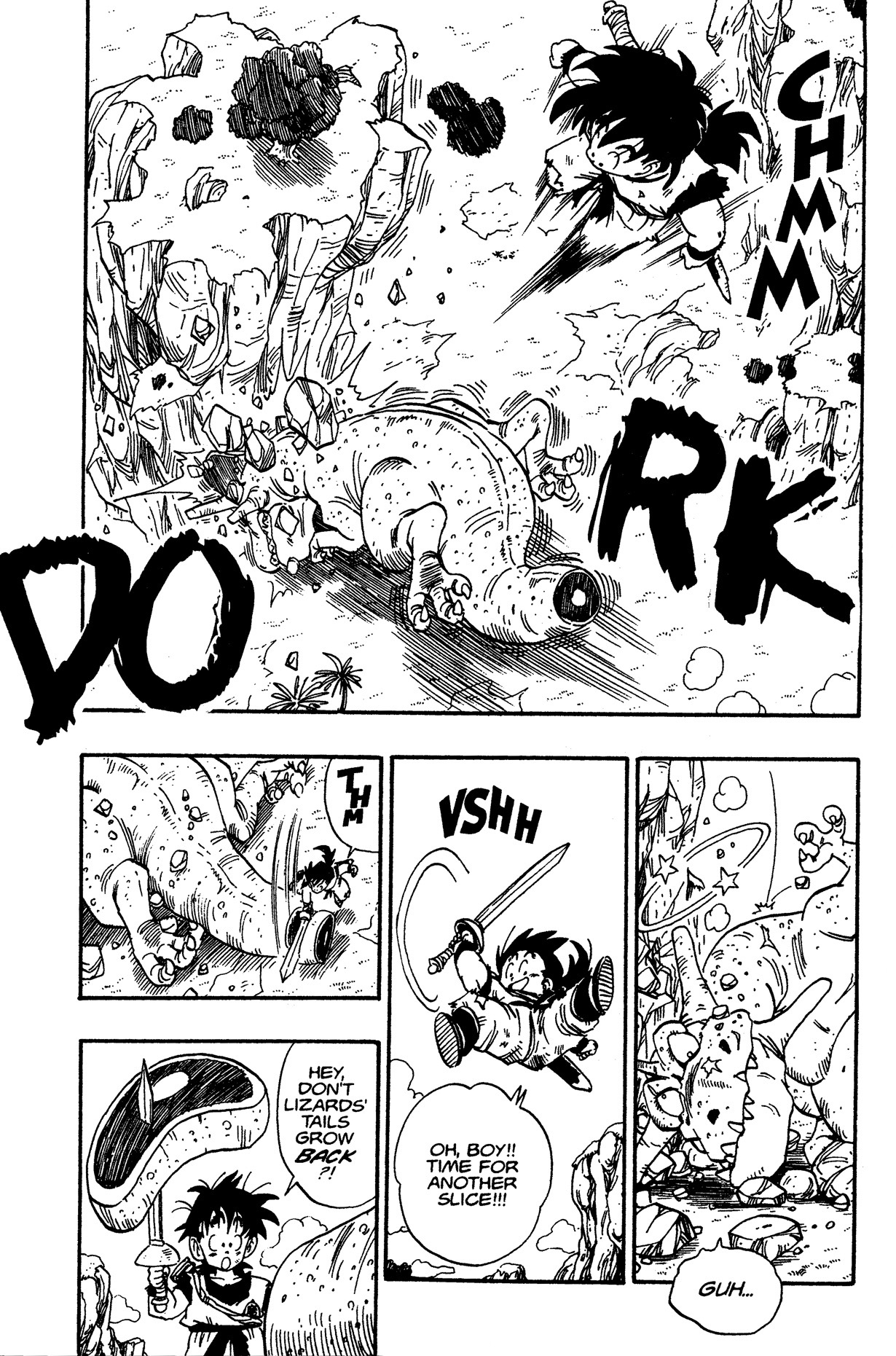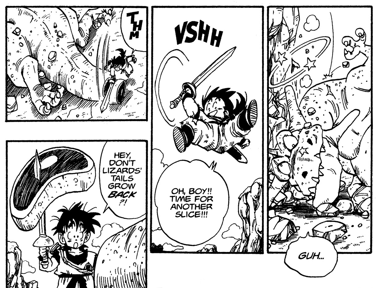 — Plus tard, Gohan parvient à couper un gros morceau de la queue du dinosaure avec son épée.