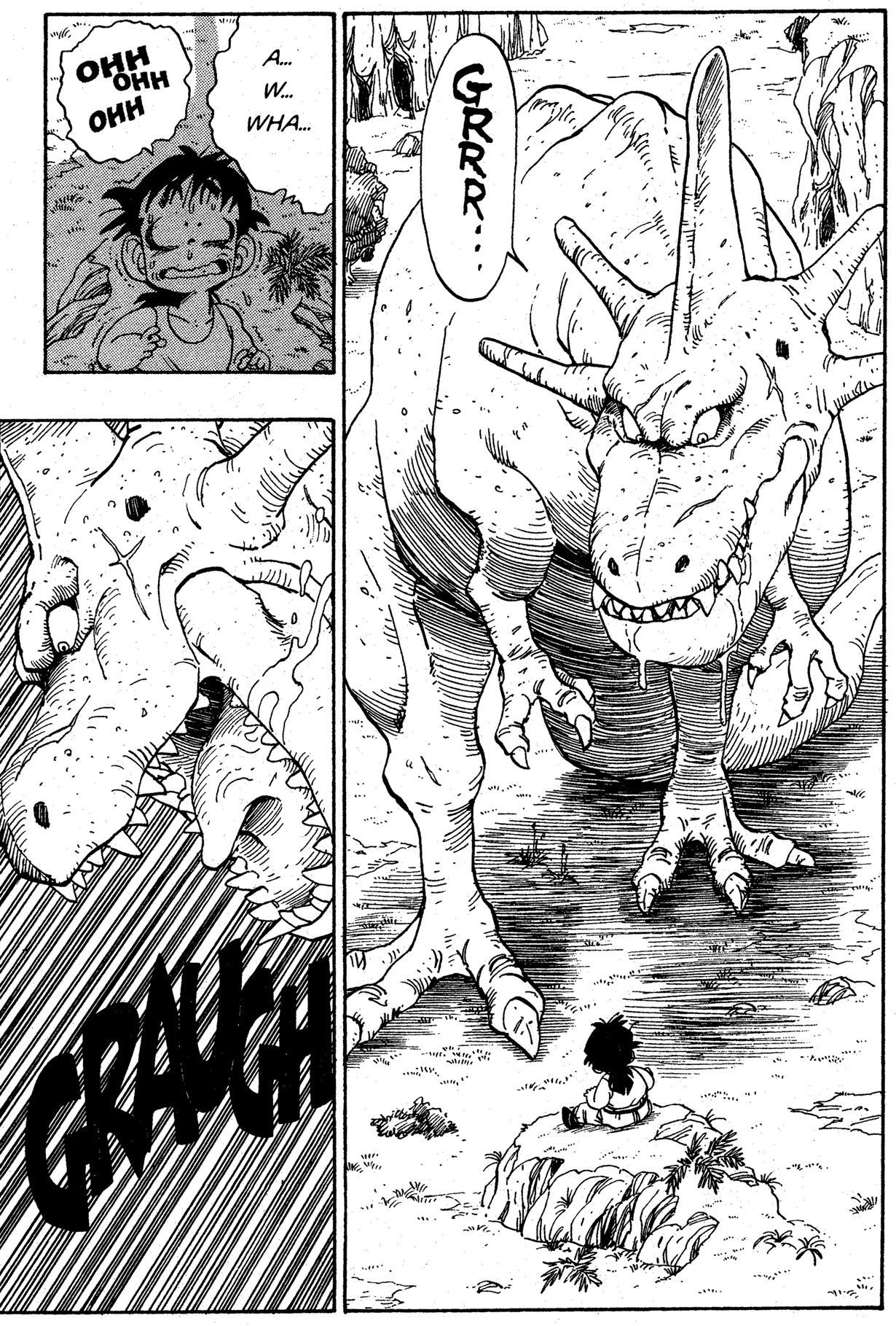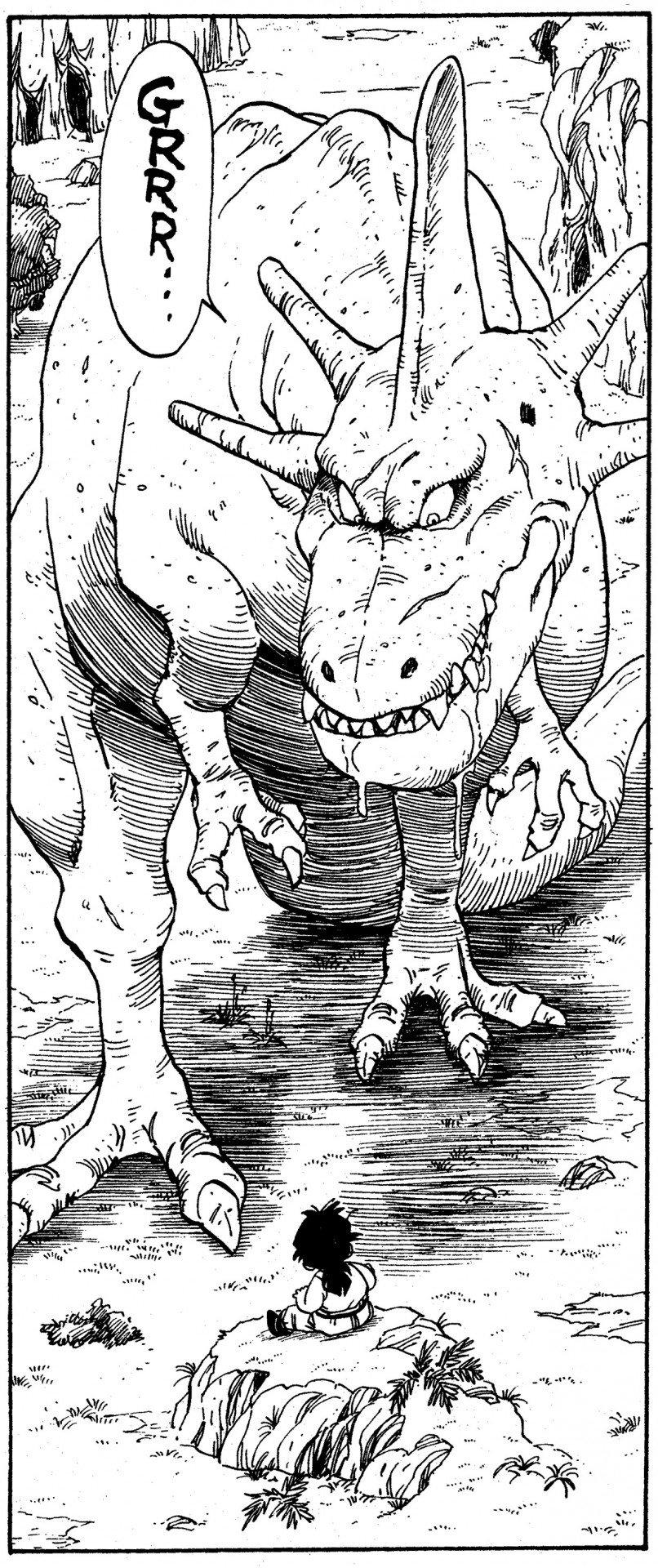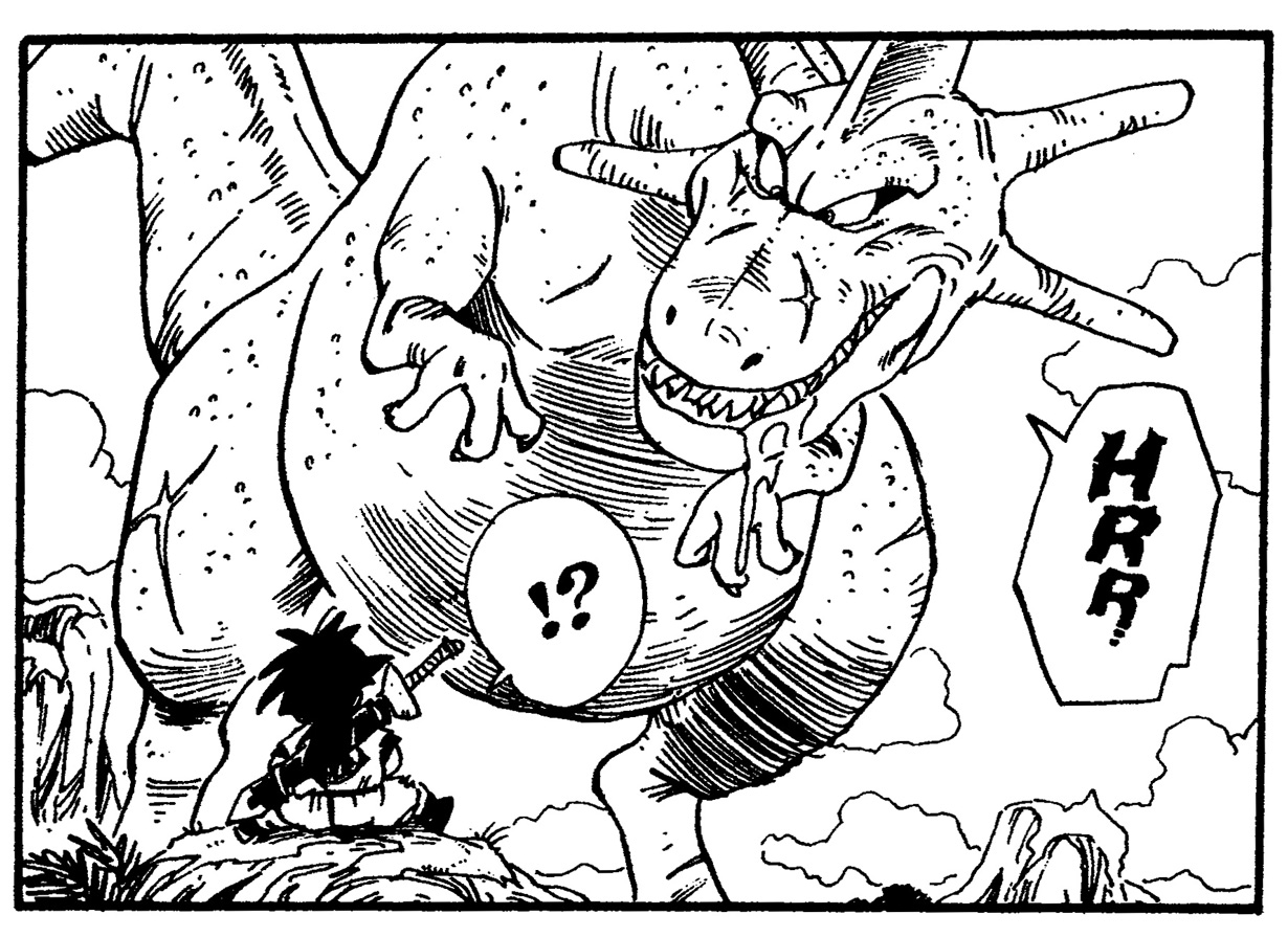- Ça a l'air très amusant! Alors maintenant, j'aimerais vous poser des questions sur les dinosaures qui apparaissent dans Dragon Ball. Pour commencer, comment classeriez-vous le dinosaure que Gohan a combattu lors de son entraînement dans les terres désolées ?