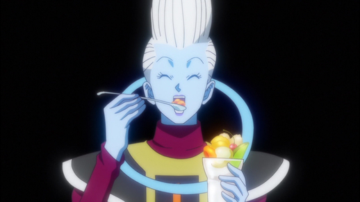 Alors qu'une bataille bouleversante se déroule entre Goku et Beerus, Whis peut être vu sur la touche se régalant d'un délicieux parfait.