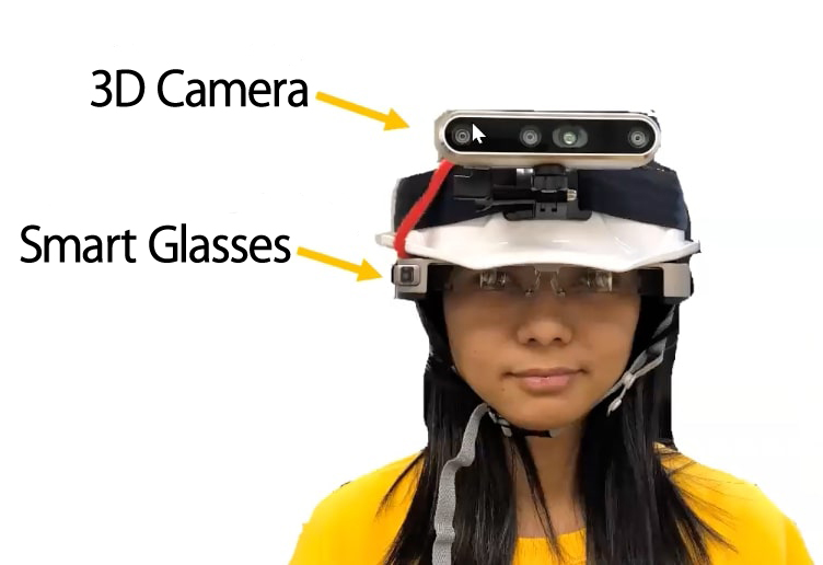 Il s'agit d'un appareil doté d'une caméra 3D et de lunettes intelligentes (un écran en forme de lunettes) fixées à un casque. Les lunettes intelligentes affichent le paysage environnant en temps réel.