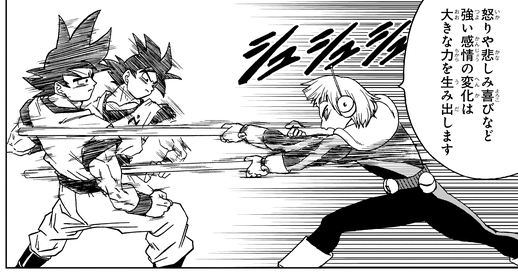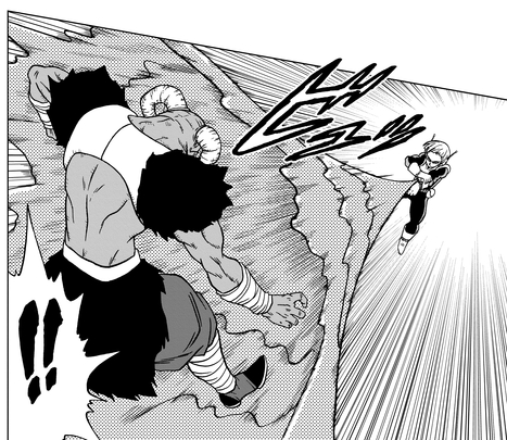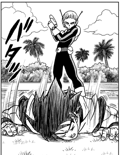 Alors que Merus regarde Moro utiliser sa capacité de copie pour coincer Goku, il maudit son incapacité à aider son camarade Saiyan à perfectionner sa transformation Ultra Instinct .
