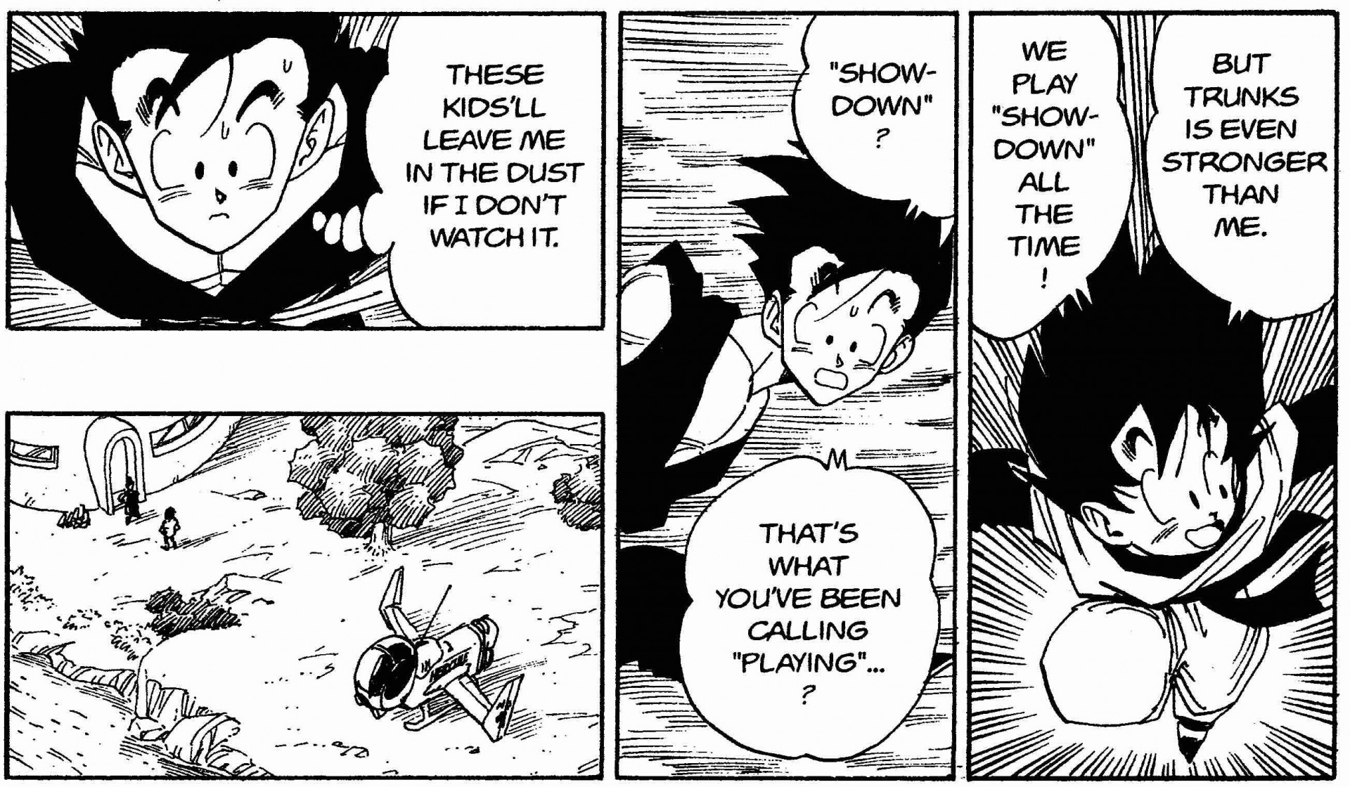 ——Alors même à 8 ans, Trunks est déjà un "guerrier". Cependant, nous voyons également qu'il est encore un enfant quand il est sur le point de perdre contre Goten et commence à utiliser sa main gauche pour gagner.