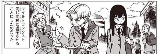 Quelques jours plus tard, Mai commence à fréquenter le lycée Blue Hal avec Trunks et Goten.