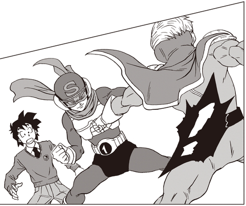 Il l'attrape immédiatement pour la ramener à la cachette et laisse la bataille contre Saiyaman X1 à Beta No. 2.