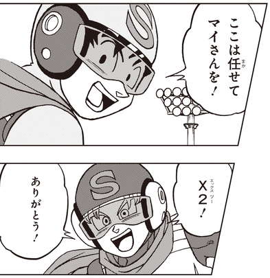 Mais juste au moment où il semble que la Beta No. 1 va s'en tirer avec Mai et le disque, Goten entre dans la mêlée en tant que Saiyaman X2 et s'engage avec la bêta n°2 !