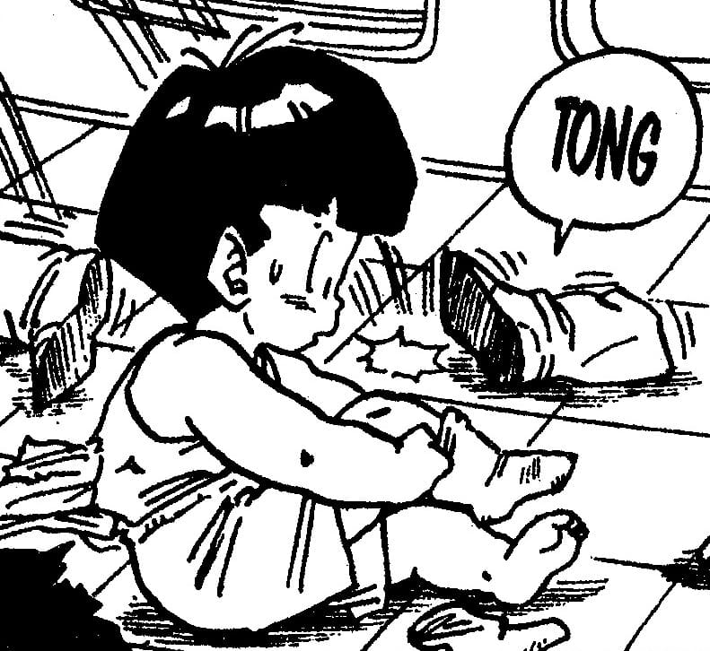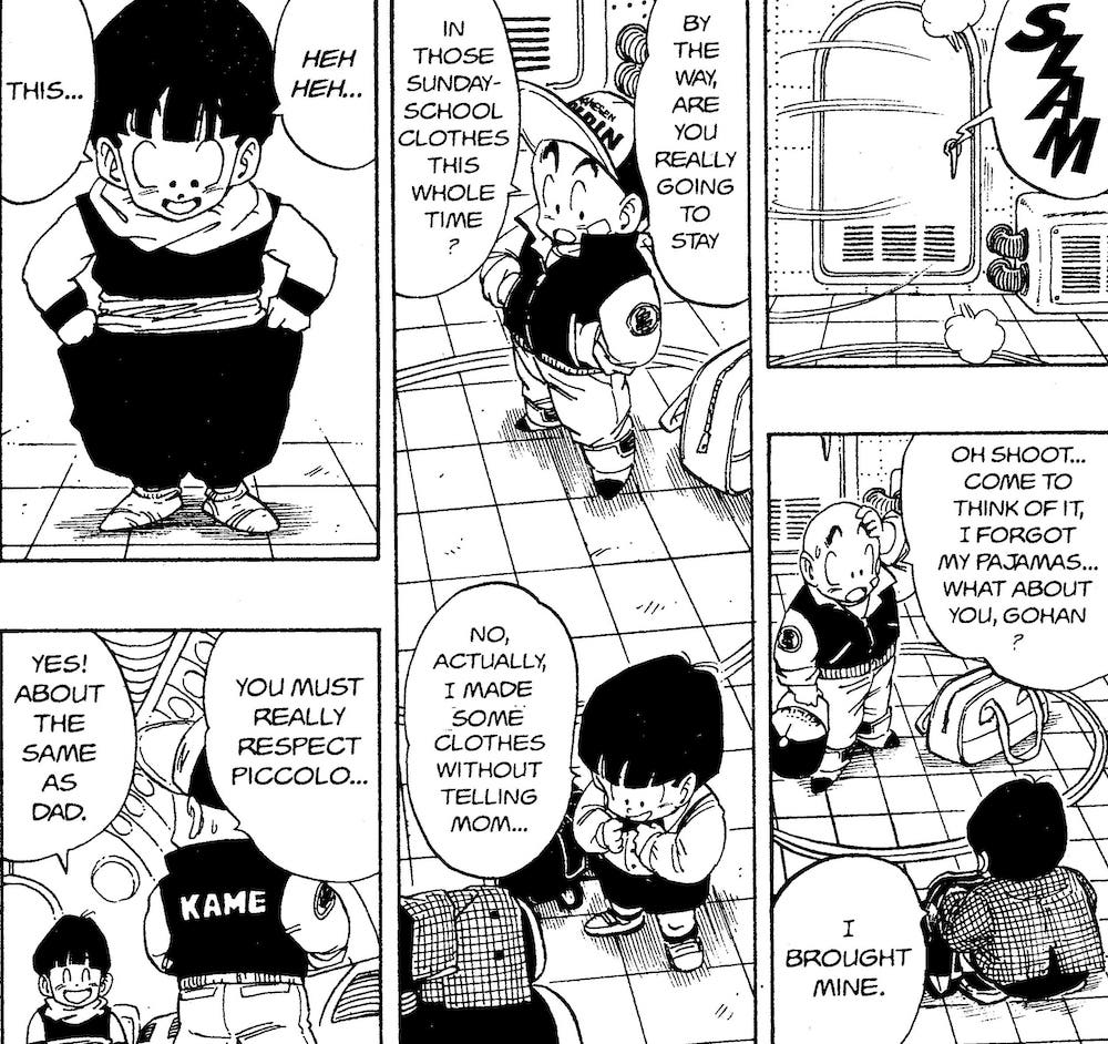 ・La scène où Gohan se présente au navire en direction de Namek avec une coupe au bol et Krillin dit que sa tenue ressemble à des vêtements d'école du dimanche. Aussi, la scène où il enlève ses chaussettes pour se changer dans son armure de combat. Tellement mignon!