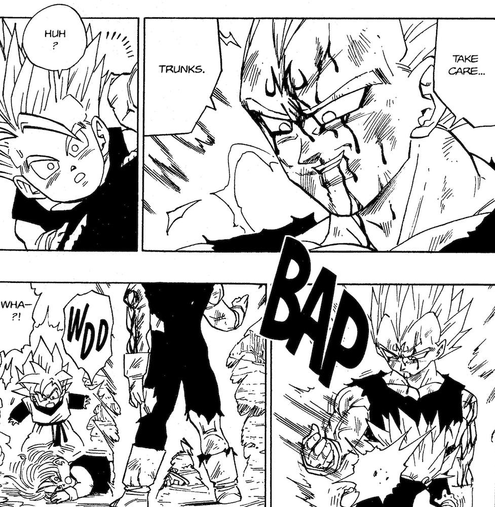 ・Dans l'épisode 120 de Kai, lorsque Vegeta a étreint Trunks pour la première fois et lui a dit de faire attention, puis l'a assommé. Il était l'incarnation d'un noble sacrifice.