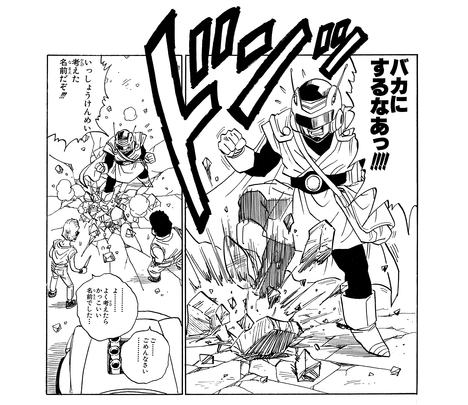 Cependant, les deux pilotes déchaînés étaient clairement trop denses pour apprécier la génialité de Great Saiyaman, riant, "Ha, ha, ha !! C'est tellement nul !! Ça va avec la tenue boiteuse, cependant !!" Leur ignorance a pénétré la peau de Great Saiyaman, qui a clairement indiqué à quel point il était sérieux, ce qui a amené le duo à réfléchir à leurs actions avant de partir.