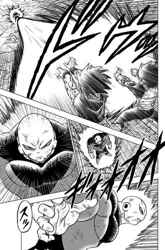 Jiren ignore également l'atout de Super Saiyan God Super Saiyan Goku, le Kaio-ken, avant de faire sortir Kamesennin de l'arène d'un simple coup.