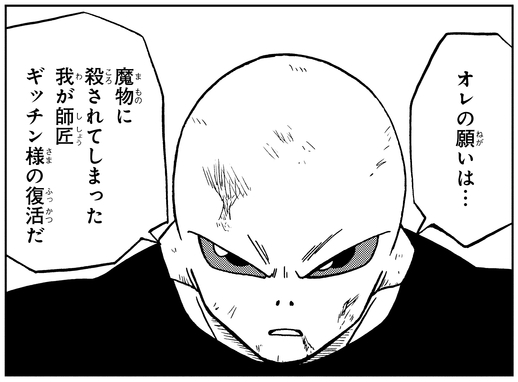 Incapable d'être reconnu par Gicchin comme son successeur avant son décès, Jiren a voulu le ressusciter pour lui montrer l'incroyable pouvoir qu'il avait acquis.