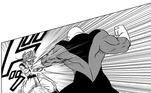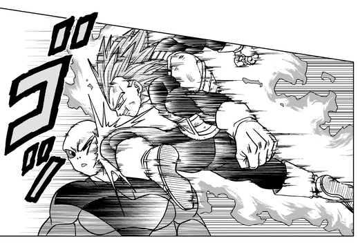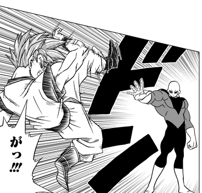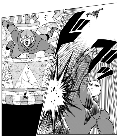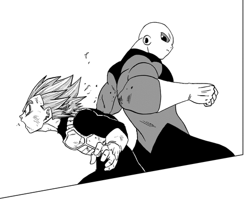 Ensuite, Vegeta dépasse les limites de la transformation Super Saiyan God Super Saiyan et parvient même à décrocher des coups éblouissants sur le défenseur de l'Univers 11. Jiren répond en disant que bien que les attaques du prince Saiyan soient les meilleures qu'il ait connues jusqu'à présent, il n'a toujours aucune chance de victoire, avant de contrer avec une frappe féroce.