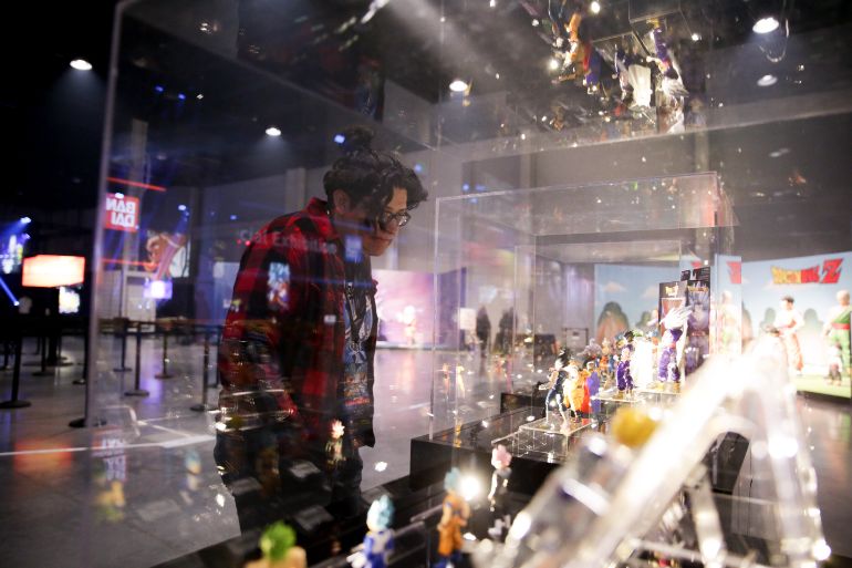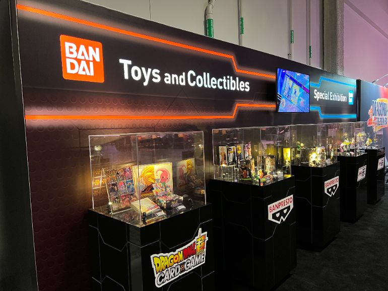 Un stand d'expositions présentant des figurines Dragon Ball de divers fabricants.