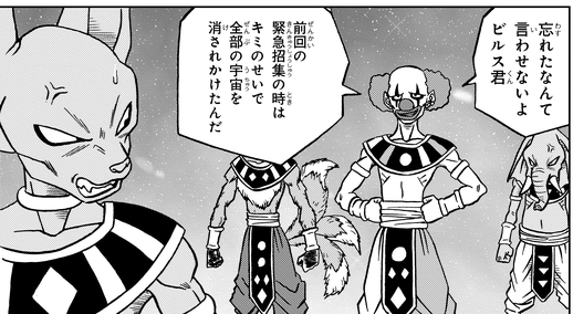 C'est là qu'il défie Beerus, déclarant que le God of Destruction de l'univers 7 était la raison pour laquelle tous les univers ont presque été détruits lors de leur dernier rassemblement divin, ce qui retourne également les autres dieux contre Beerus .