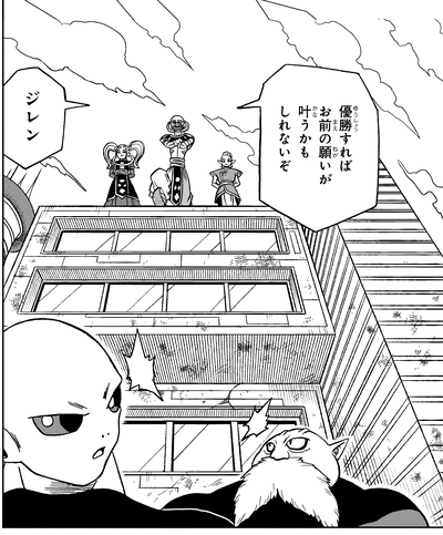 Belmod se rend personnellement auprès de Jiren pour lui demander de participer au Tournament of Power. Pour convaincre le puissant guerrier de participer à la compétition, Belmod promet de ressusciter le défunt maître de Jiren, Gicchin, avec les Super Dragon Balls une fois qu'ils auront remporté le tournoi.