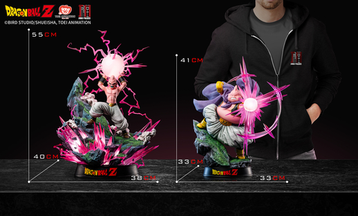 En termes de taille, Majin Buu (Good) mesure 41 cm, tandis que Majin Buu (Kid) pèse 55 cm si l'on tient compte des effets !