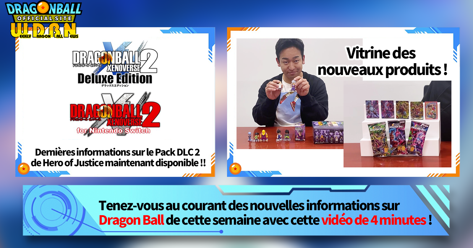 "Nouvelles hebdomadaires Dragon Ball" est une série de vidéos mise à jour tous les lundis (JST) pour vous apporter les dernières nouvelles dans le monde de Dragon Ball! Rejoignez Victory Uchida, rédacteur en chef de V Jump , alors qu'il couvre toutes les informations les plus chaudes publiées la semaine précédente ainsi que de nouvelles mises à jour telles que de nouvelles informations sur les produits et des nouvelles du site pour la semaine à venir!