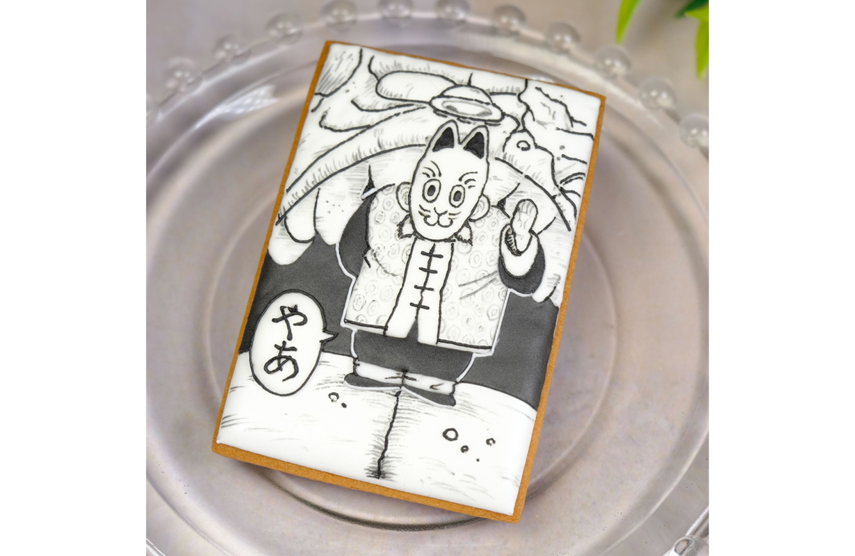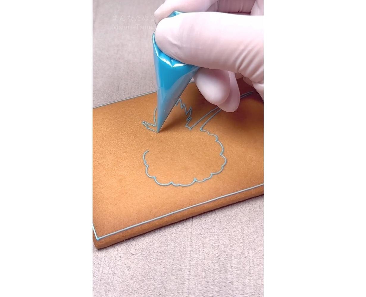 Manna-Tanuki a commencé par dessiner des lignes droites autour de l'extérieur de la base du cookie comme les cadres d'un panneau de manga, après quoi elle a commencé à dessiner un personnage à l'intérieur. Je me demande ce que pourrait être cette masse pelucheuse au milieu...