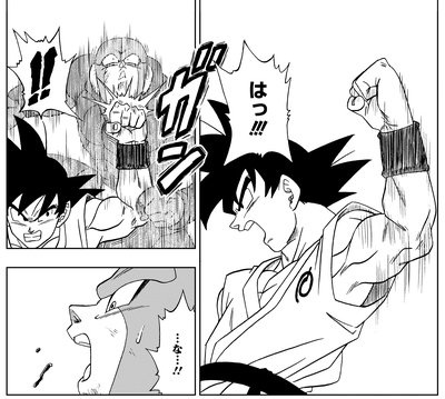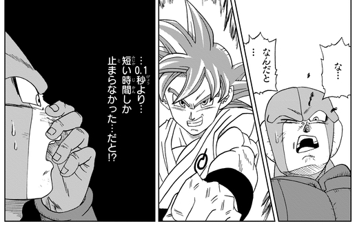 Goku est le prochain à monter sur le ring avec Hit, qui est étonné lorsque le Saiyan est capable de contrer son Time Skip en prédisant quelle attaque il va utiliser une fraction de seconde avant d'activer la technique !